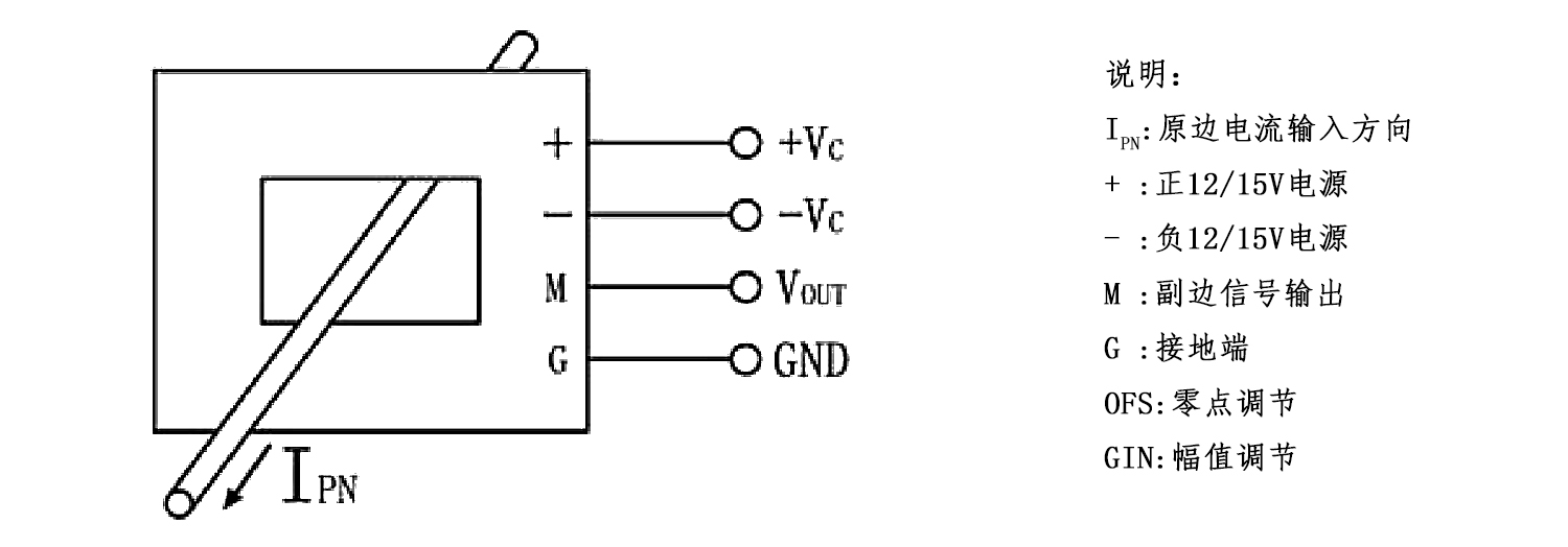 该传感器采用直测式霍尔检测原理工作。原边电流产生的磁通量聚集在磁电路中,并由霍尔器件检测出霍尔电压信号,经过放大器放大,该电压信号精准的反应原边电流。